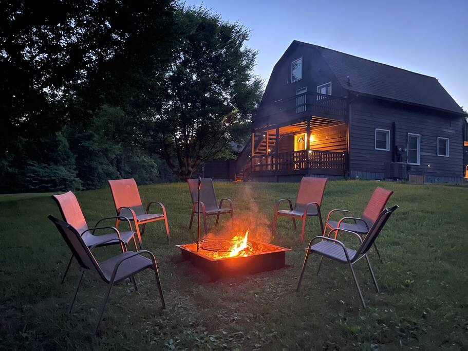 This barn-turned-house has 2 bedrooms and 2 bathrooms and a hot tub sits on 6 acres of land which is shared with the host’s home (see aerial photo). The property is in a country setting, yet it is only a few miles from town, so this makes the perfect home-base for you to explore Bloomington, IU, Nashville or Lake Monroe. We are convenient to three different boat launches and hiking at Paynetown State Recreation Area and Hoosier National Forest. Upstairs you will find a bedroom, a bathroom and a living room with a sleeper sofa and a wet bar area. Downstairs is the full kitchen, another living room and a second bathroom. We also have a convertible poker table with bumper pool. There is a retro arcade game cocktail table with over 500 classic arcade games as well as two building-block style play couches for kids to make forts to their hearts content. Outdoors, there is a luxurious 6 person hot tub and fabulous fire pit with grill grate. There is a large upper and lower back deck on which to enjoy a meal or hang out and chat. A championship level disc golf golf basket is provided which you can use for putting. The paved driveway has room for a boat trailer and up to 3 cars. Hosts have a chicken/pigeon house behind the guesthouse which you can see and guests are welcome to walk down and check out the birds. There is also a koi pond by the host’s home and if the hosts are home you are welcome to come up and hand feed the fish if you would like.